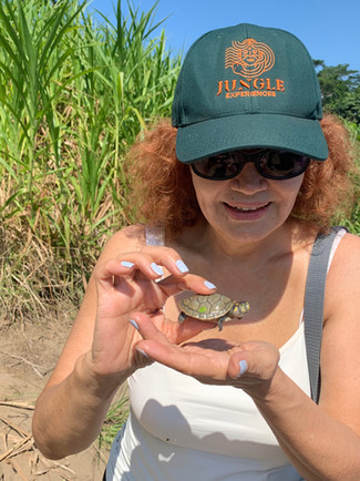 Fuimos luego a conocer a las pequeñas tortugas Taricayas rescatadas de sus huevos. Cada uno de nosotros eligió una y le dio un nombre. A continuación las fuimos a dejar al río para que volvieran a su hábitat. Desde el río algunos salieron a dar una vuelta en kayak.